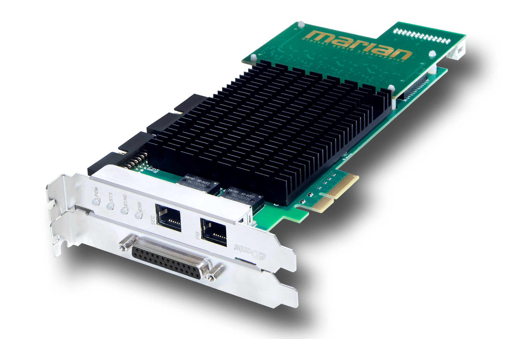 Die 4 zusätzlichen AES/EBU Anschlüsse bieten schnelle Signalkonvertierung zum Dante Netzwerk und stehen auch als separate Aufnahme/Wiedergabegeräte zur Verfügung. Sie sind als D-Sub Stecker ohne weitere aktive Elektronik ausgeführt. Somit kann dieser getrennt von der Hauptplatine frei im Computergehäuse platziert werden oder mit dem Slotblech einen beliebigen Platz neben anderen PCIe Komponenten einnehmen.